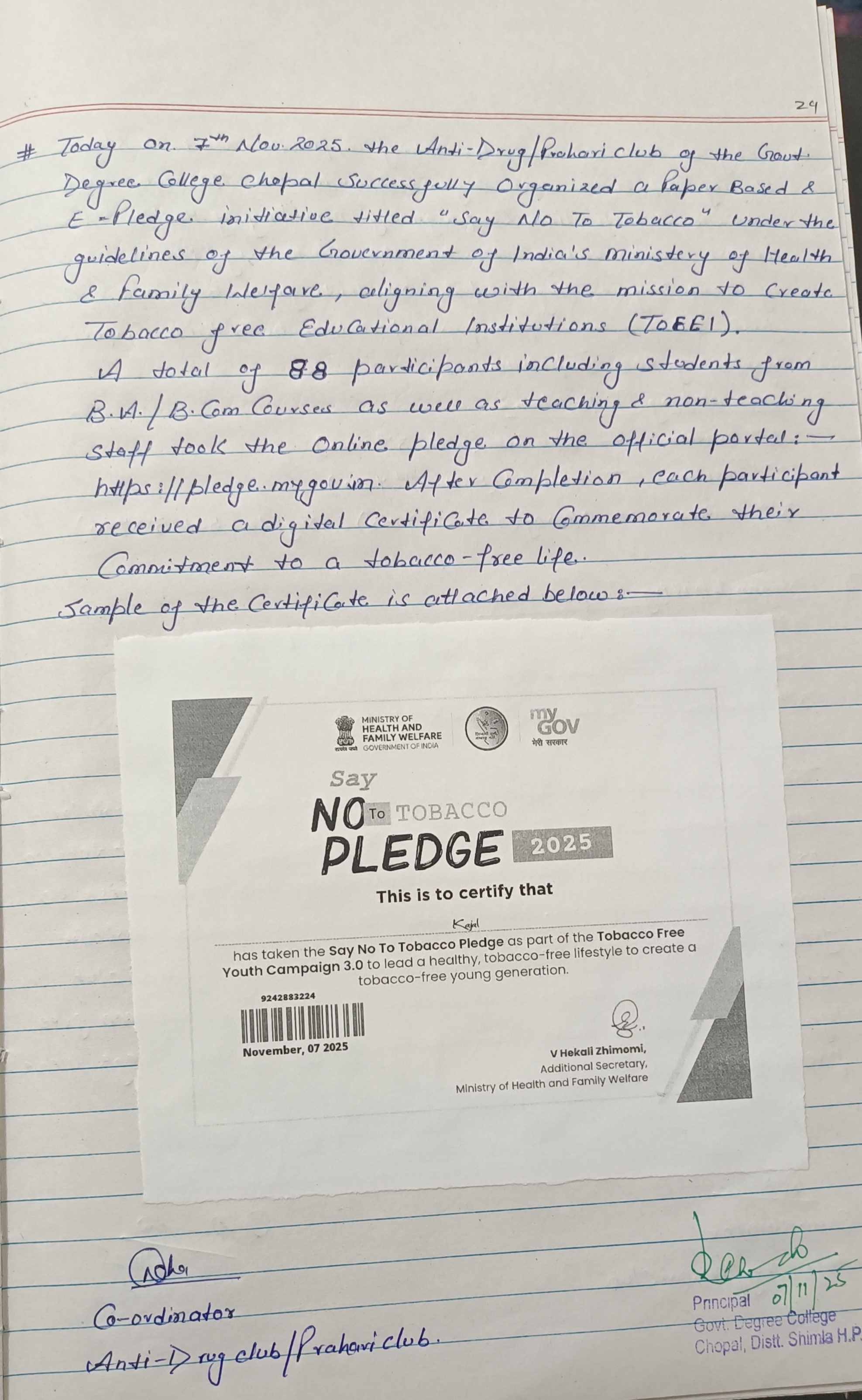 Paper Based & E-Pledge on theme 'Say No to Tobacco'