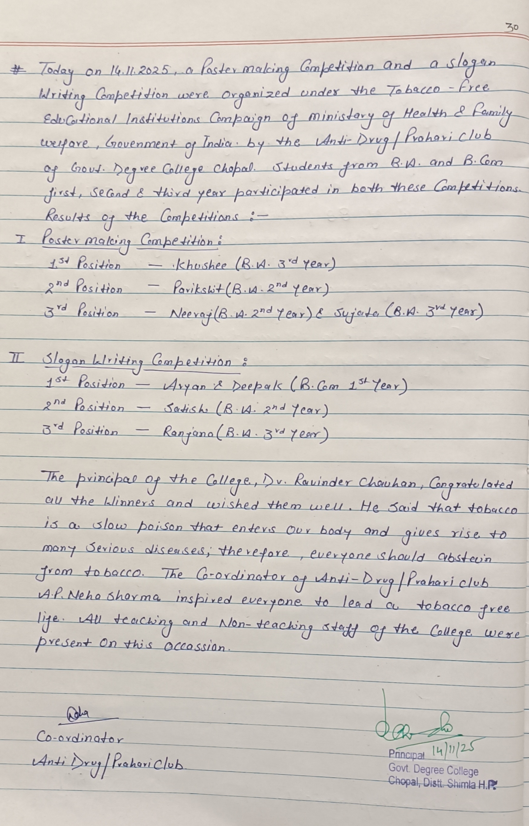 Poster Making & Slogan Writing Competition on theme 'Say No to Tobacco'